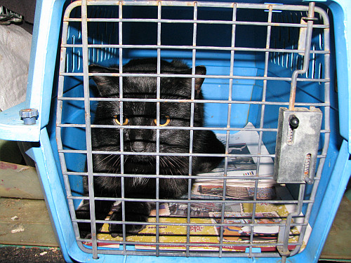They arrived here Wednesday in an assortment of carriers and cages, including two small animal cages, with three cats each inside. I had to seperate all of them out and put them into my own carriers, which makes my cats mad. They use those carriers as beds. The people who picked them up had to borrow three of my carriers to take them back. I hope they get those back quickly or my cats will go on strike.